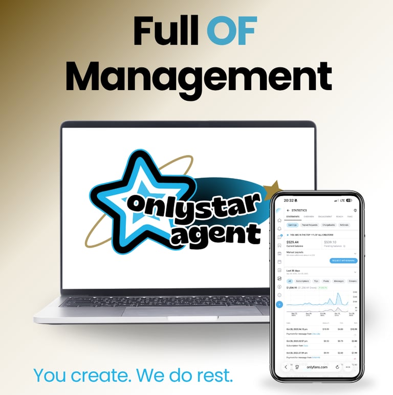 Welcome to OnlyStar Agent, a full-service creator management agency built on one principle: you focus on creating, we handle everything else. Backed by many years of experience running a successful marketing agency, our expert team takes over your marketing, 24/7 sales chatting, and daily account management, turning your content into a high-performing business. We are proven partners in growth - our strategies are so effective that our models typically see their earnings climb to over $1,000 a week within just the first few weeks of joining, with earnings often growing to several, or even tens of thousands per week later on. We manage the business and protect your brand, so you can focus on what you do best.